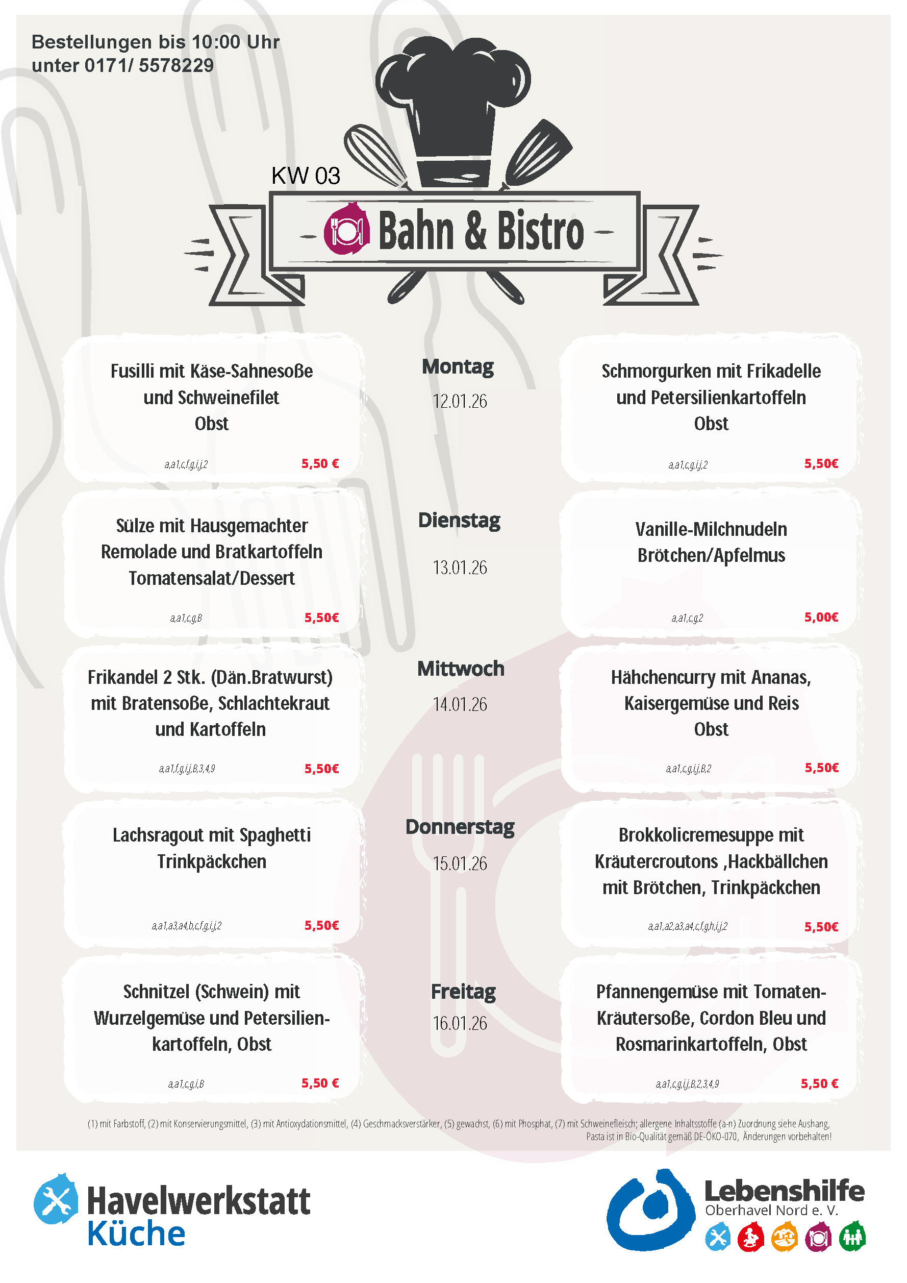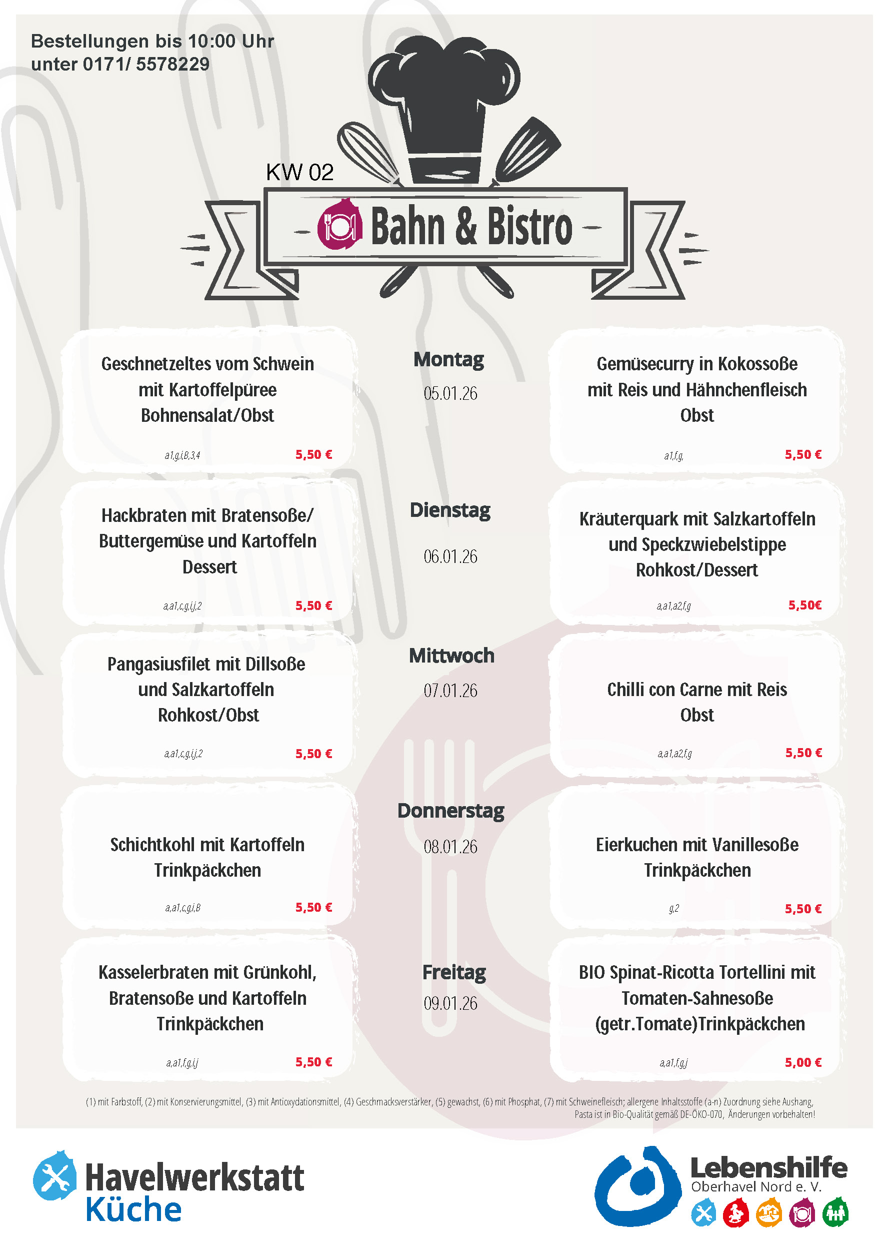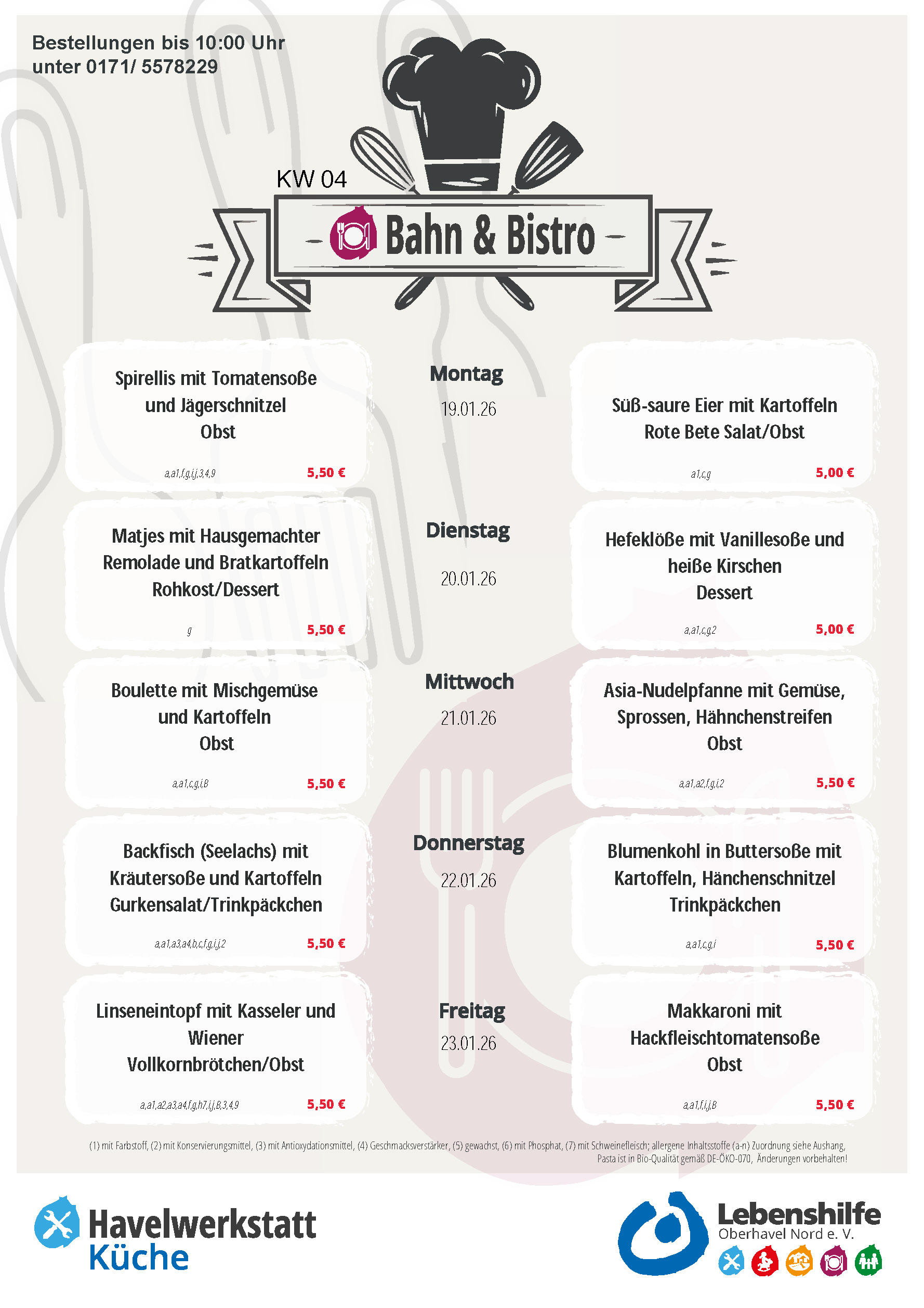 Bestellungen spätestens bis 10:00 Uhr unter 0171/ 5578229 im Bahn & Bistro!!!