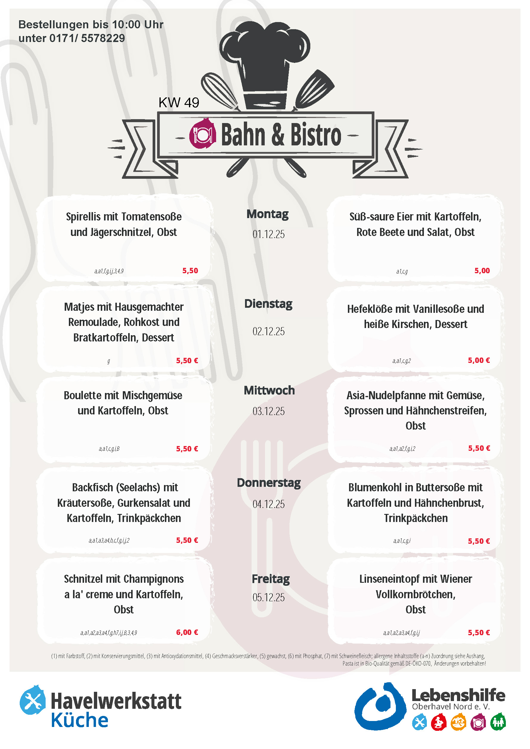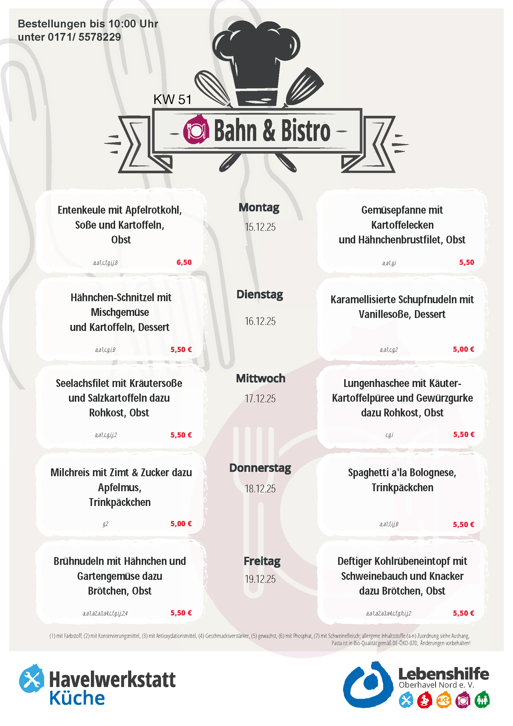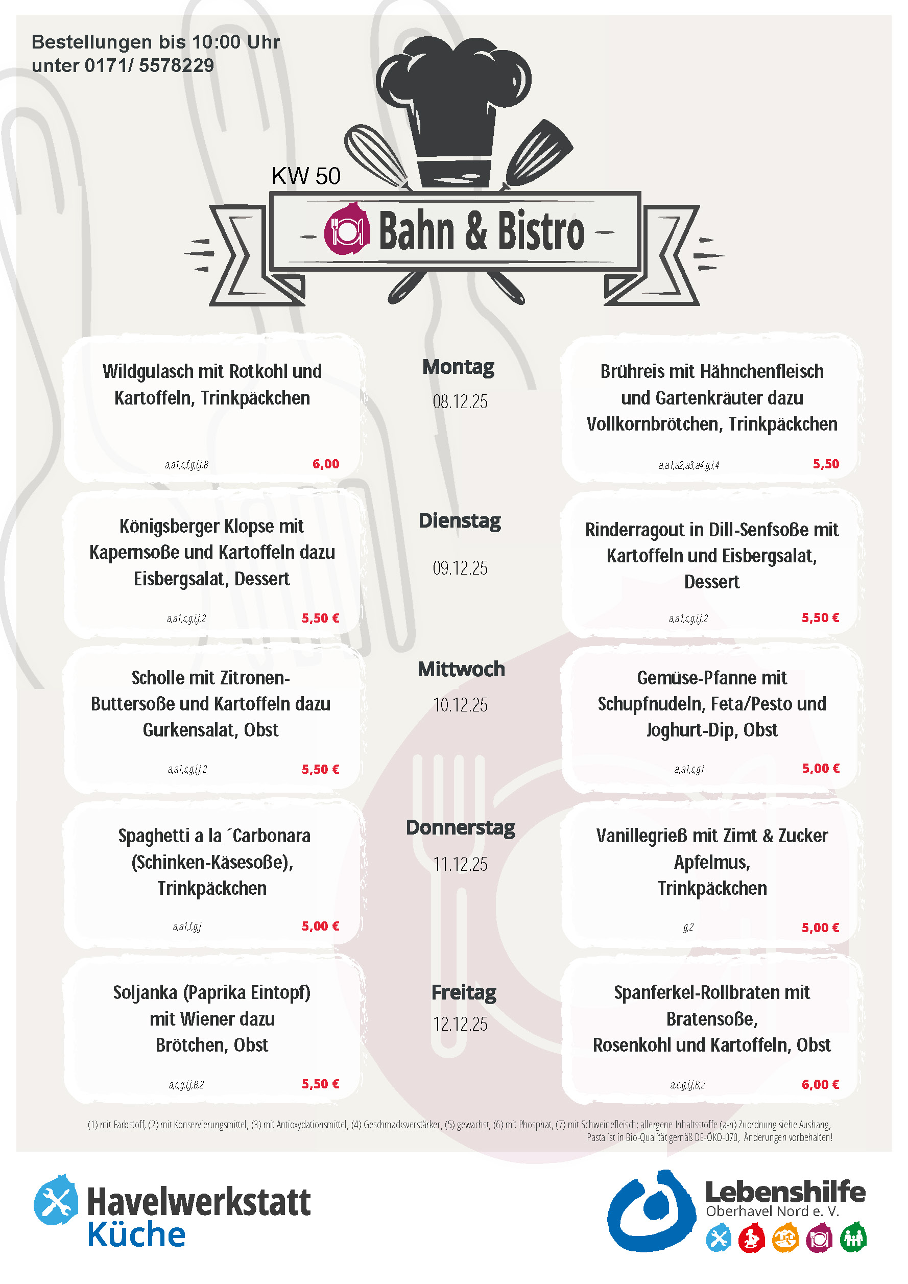 Bestellungen spätestens bis 10:00 Uhr unter 0171/ 5578229 im Bahn & Bistro!!!